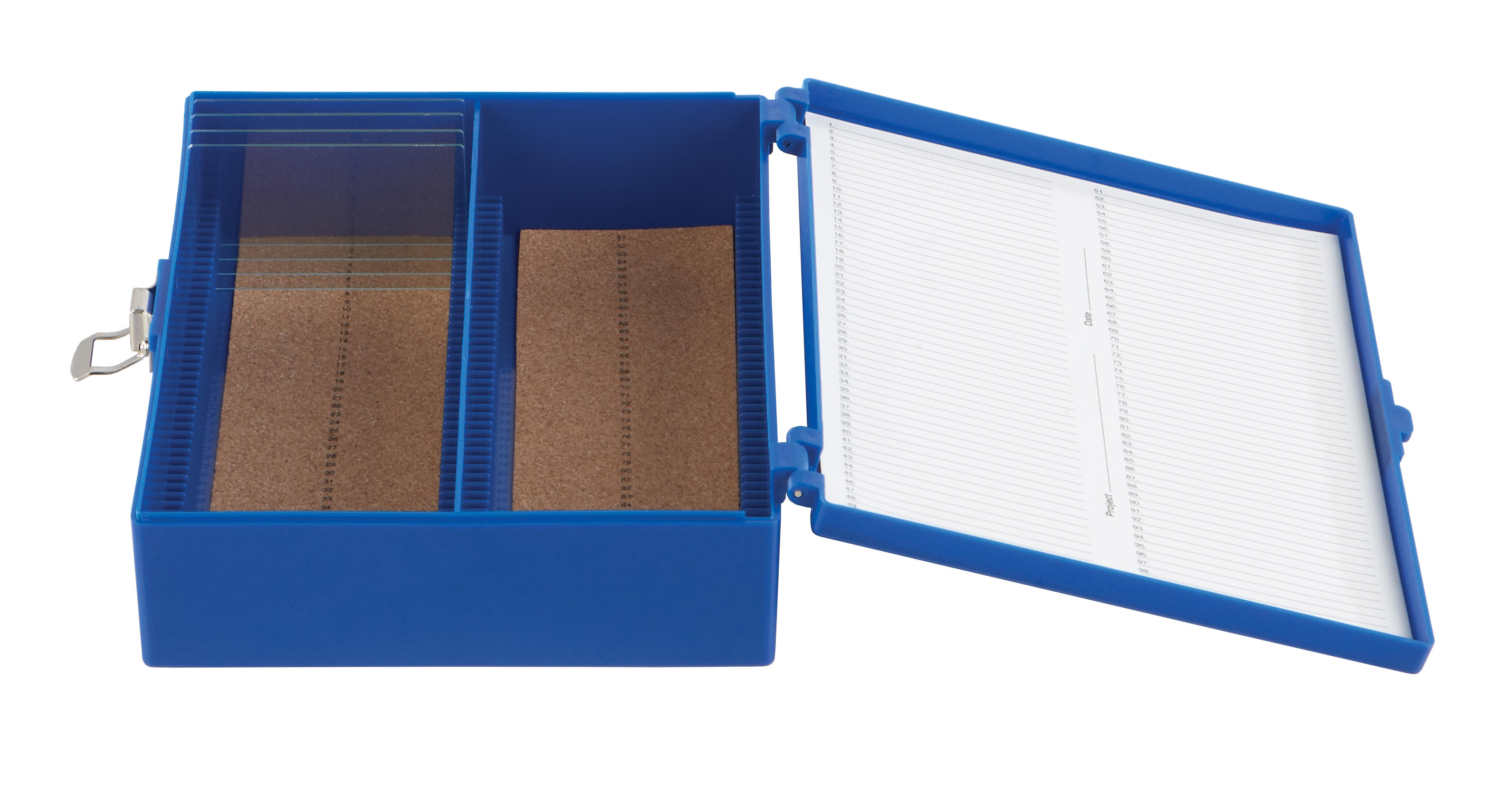 Blue Color, capacity 100, Size 208 x 175 x 60mm, Slide box is designed for storage and transport of non-standrd microscope slides.