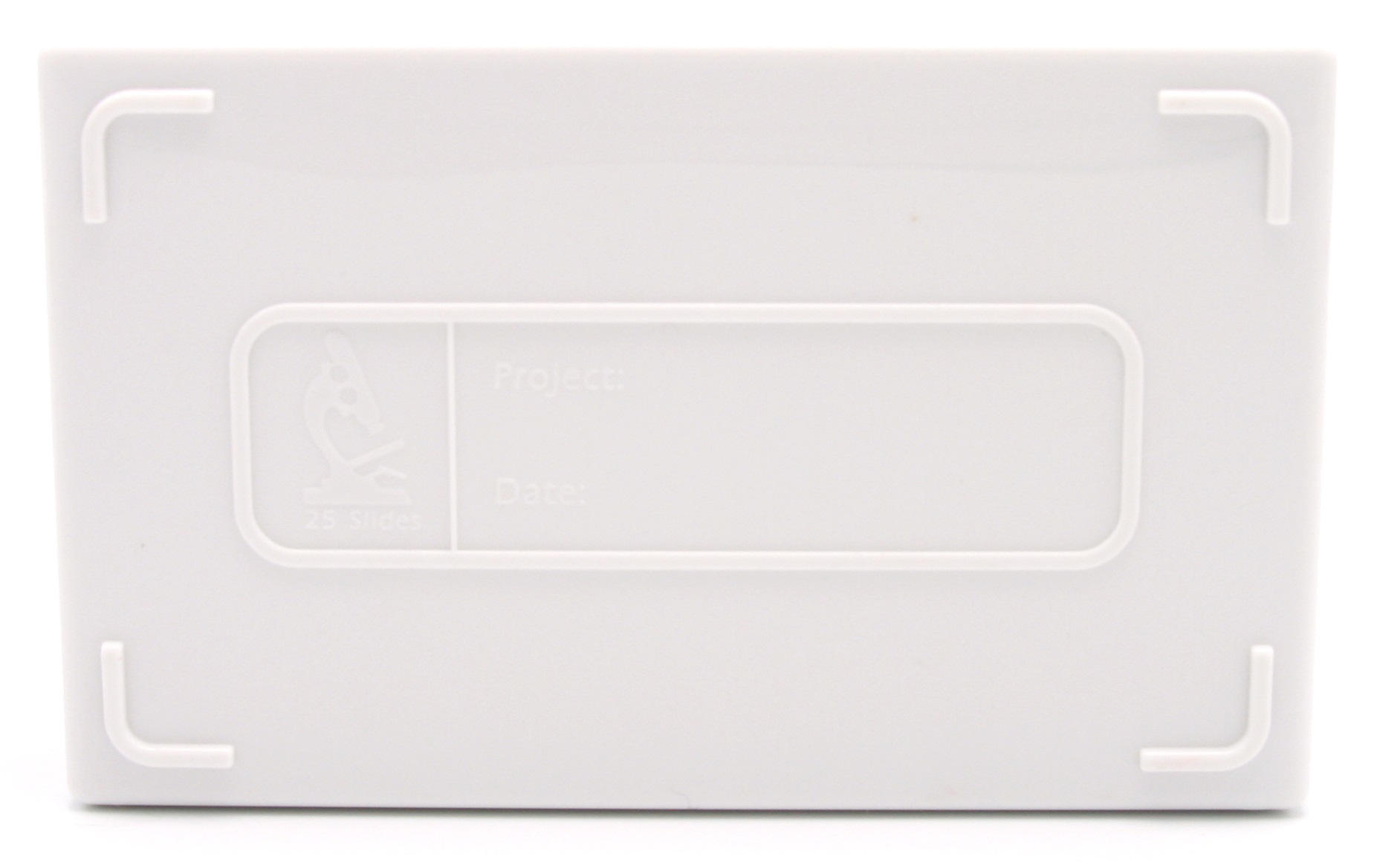 Microscope Slide box, 25 place, cork, white, easily access slides with friction-fix cover, measurement 141 x 88 x 35mm.