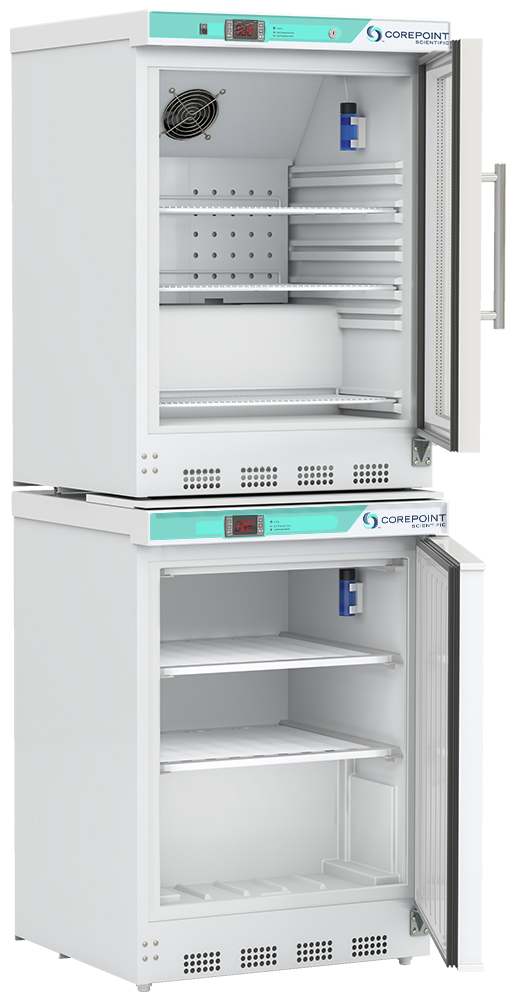 Corepoint Scientific White Diamond Series Refrigerator & Freezer Combination, 9 Cu. Ft. (4.6 Ref./4.2 Freezer), Glass Door Ref., Solid Door Freezer