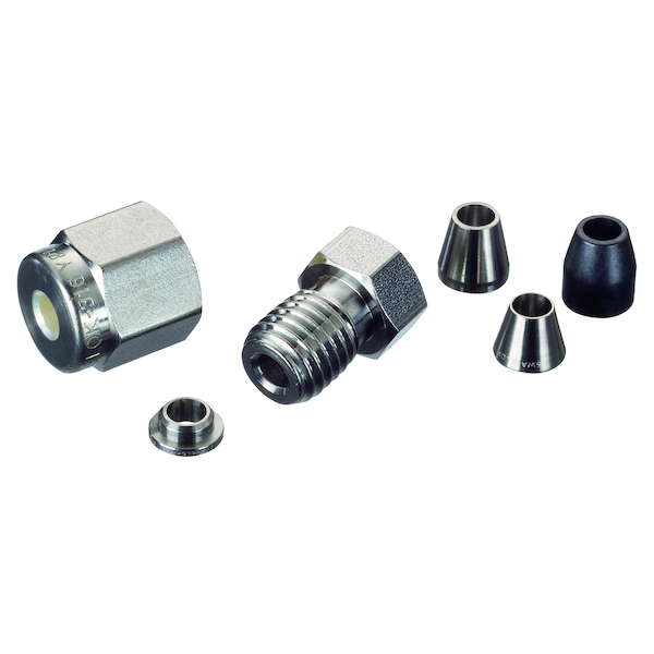 Restek Packed Column Installation Kit; for 2 mm ID columns; for valve applications. Kit contains: 1/8" stainless steel nut (1), stainless steel Valco nut (1), 1/8" Vespel/graphite ferrule (1), stainless steel Valco ferrule (1), 1/8" stainless steel front