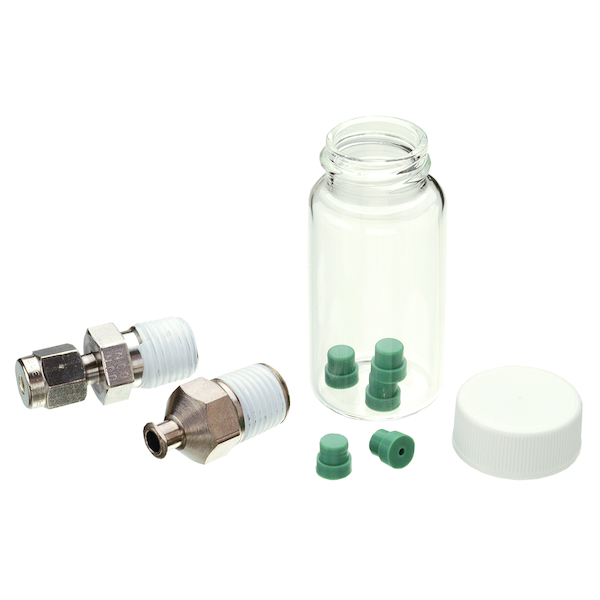 Restek Syringe Adapter Kit, For use with VOC single stage regulator. Kit contains one nickel-plated brass 1/4" NPT to female luer fitting, which can be used with an A-2 Luer syringe (cat.# 20162 or 20163), and one stainless steel 1/4" NPT x 1/8" compressi