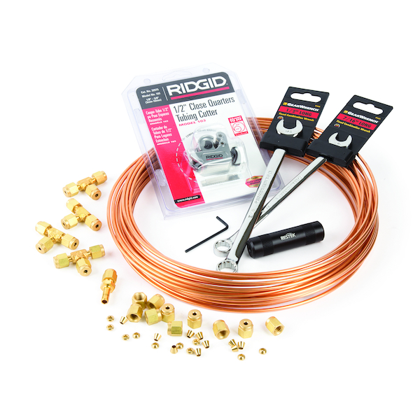 Restek GC installation kit. Includes: tubing cutter, 1 - 1/8" x 1/4" reamer; 1-1/8" x 1/4" brasstube end reducer, 1-7/16" wrench, 1-1/2" wrench, 4 x 1/8" brass tees, 10 x 1/8" brass nuts, 10 x brass front and back ferrules and 50' x 1/8" pre-cleaned coppe