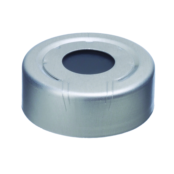 Aluminum Seal w/Septa, 20mm Press Rel.Silvr w/PTFE Gray Butyl 100Pack