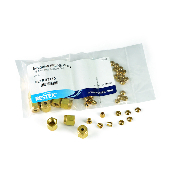 Swagelok Fitting, Brass, 1/8" Nut and Ferrule Set, 20-pk. Note: Nuts and ferrules are not treated unless requested (custom parts). Nuts and ferrules normally are not in contact with sample pathway, and thus do not require coating.