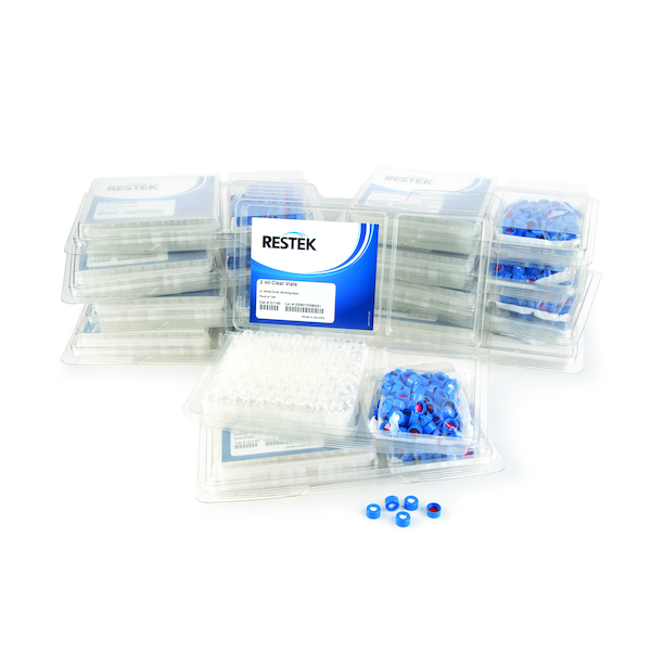 Restek 2.0mL clear vials with marking patch; 9mm; screw thread; includes blue caps with installed PTFE/silicone septa; not assembled; pkg/1000.