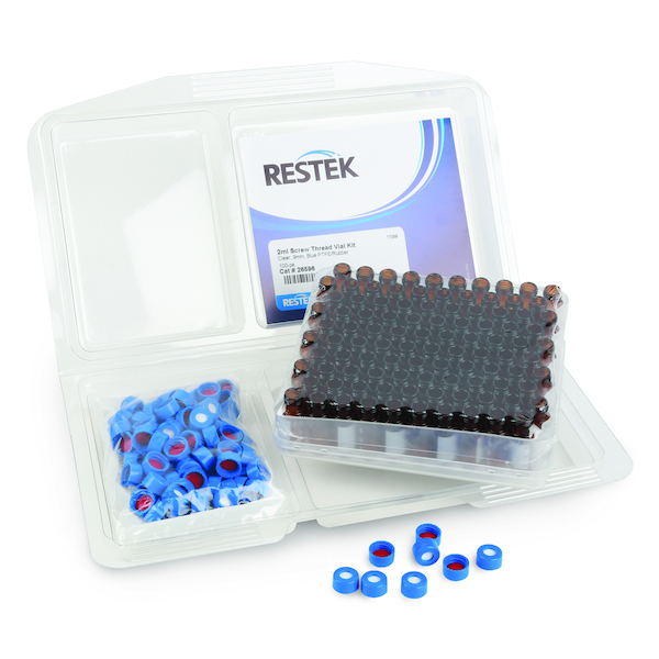 Restek 2ml Screw Thread Vial Kit, Amber w/Grad Marking Spot 9mm, Blue PTFE/Silicone Liner 100-pk.
