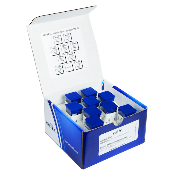 Restek GC Multiresidue Pesticide Kit; comprehensive 203-compound kit covers food safety lists by the FDA, USDA, and other global governmental agencies; individual ampuls also sold separately.