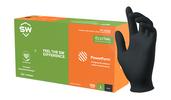SW® PowerForm® PF-95BK Black 5.0mil, EcoTek® Sustainable Technology, Biodegradable Nitrile Exam Gloves – X-Large, 10 boxes per Case (100 Gloves/Bx, 1000 Gloves/Cs).